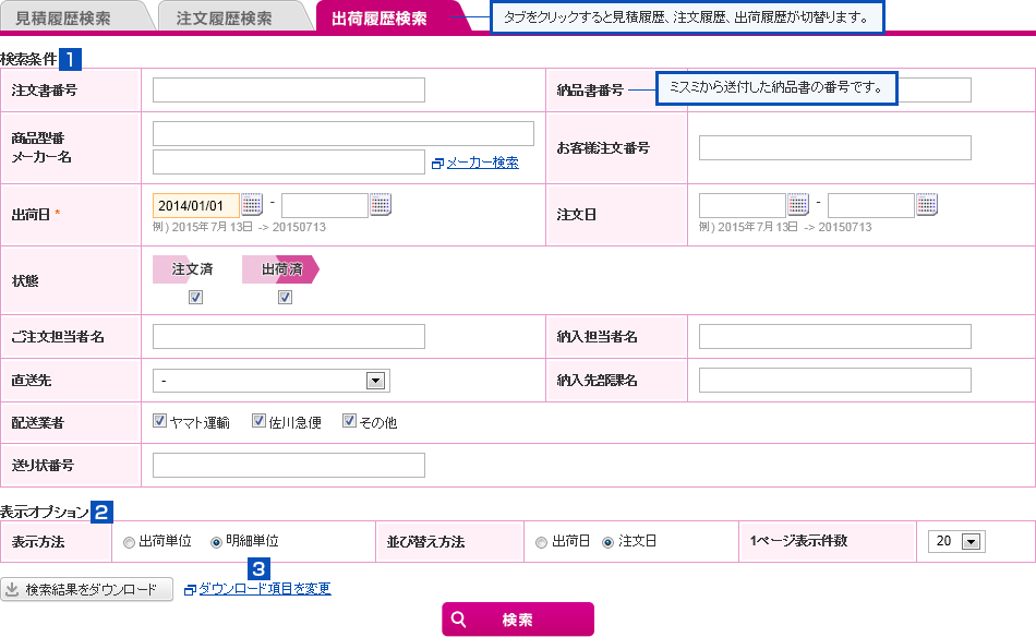 注文番号や納品書番号がお分かりの場合は、指定するとすばやく見つかります。