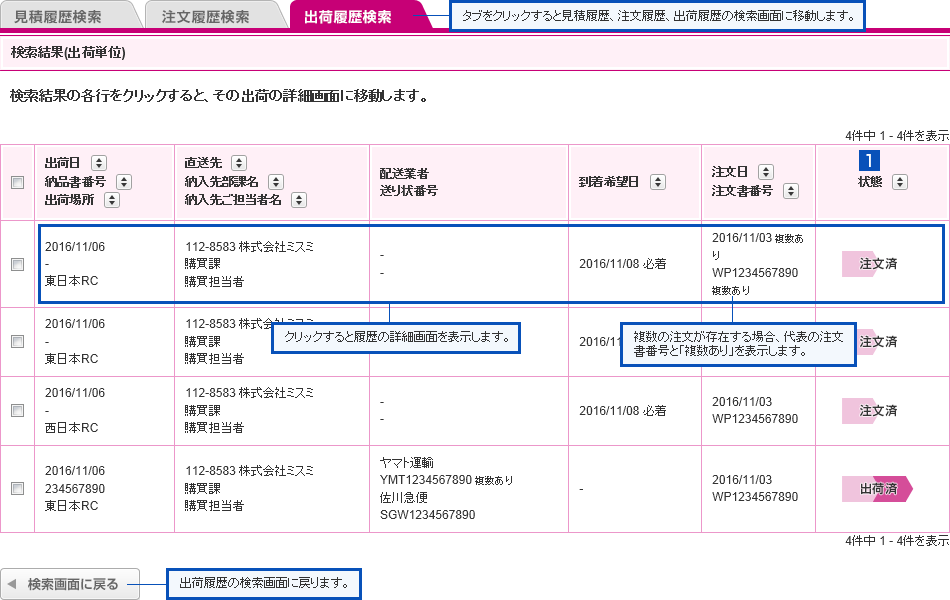 検索画面で指定した条件の検索結果が出荷単位で一覧表示されます。