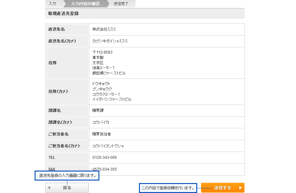 内容に問題ない場合は、[送信する]ボタンをクリックしてください。直送先の登録依頼がミスミに送信されます。