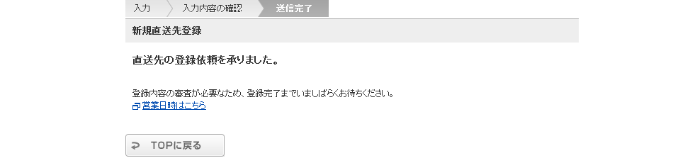 直送先の登録申請が完了しました。登録には審査が必要なため少々お時間をいただく場合があります。