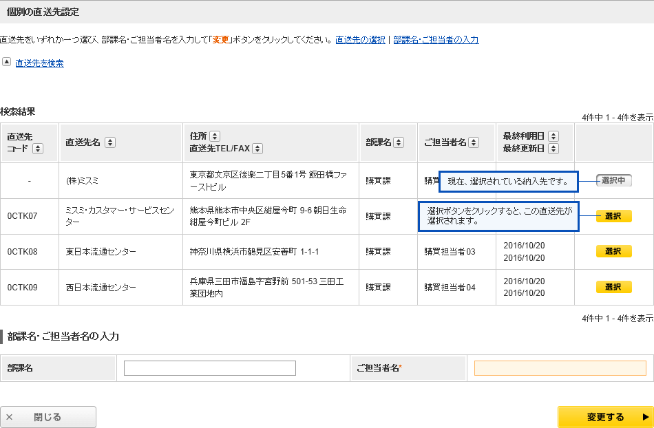 直送先をいずれか一つ選び、部署名・ご担当者を入力して