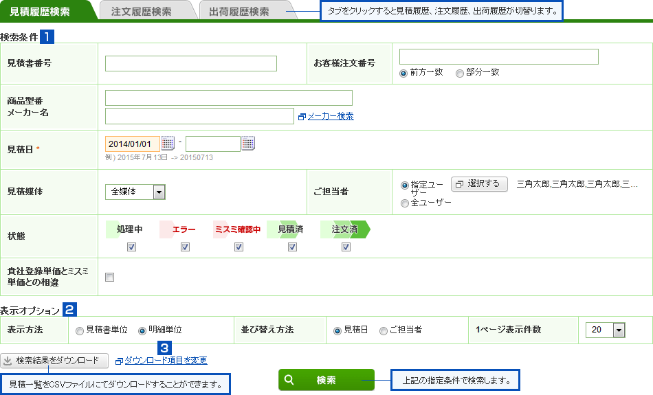 見積書単位で表示する場合は⇒ 検索結果一覧(見積書単位)画面