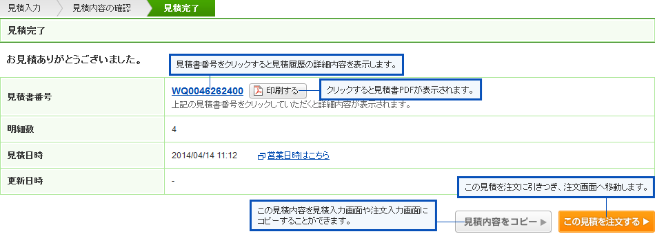 ボタンをクリックするとお見積時の単価・金額でご注文いただけます。