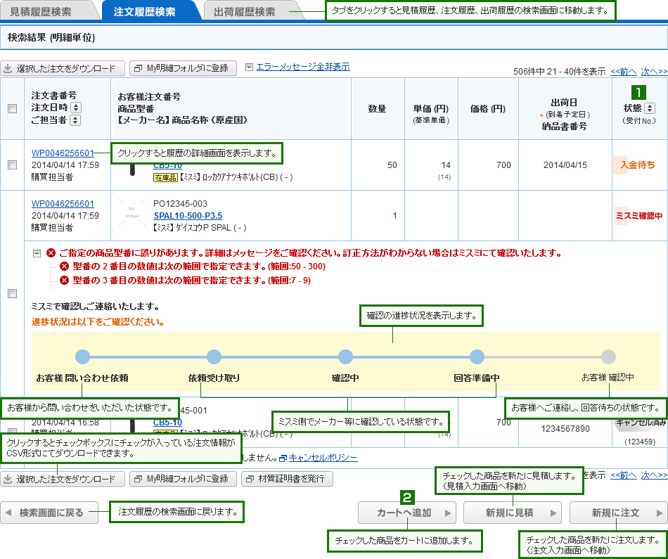 ミスミ確認中: なんらかのエラーがあり、ミスミ側で確認中 or ミスミで確認してお客様へご連絡し、回答待ちの状態。