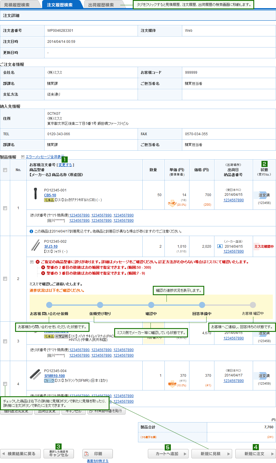 詳細画面ではお客様注文番号の変更、商品のキャンセルが可能です。
