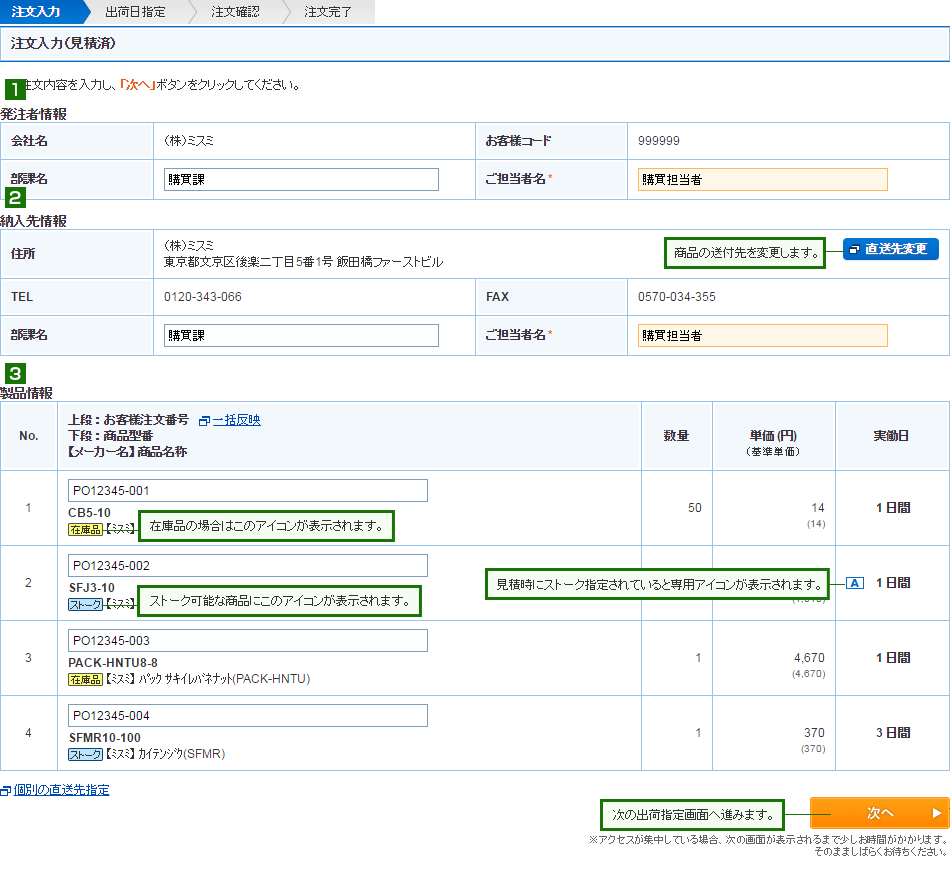 必要に応じて[お客様注文番号]を修正してください。商品型番の修正や追加はできません。