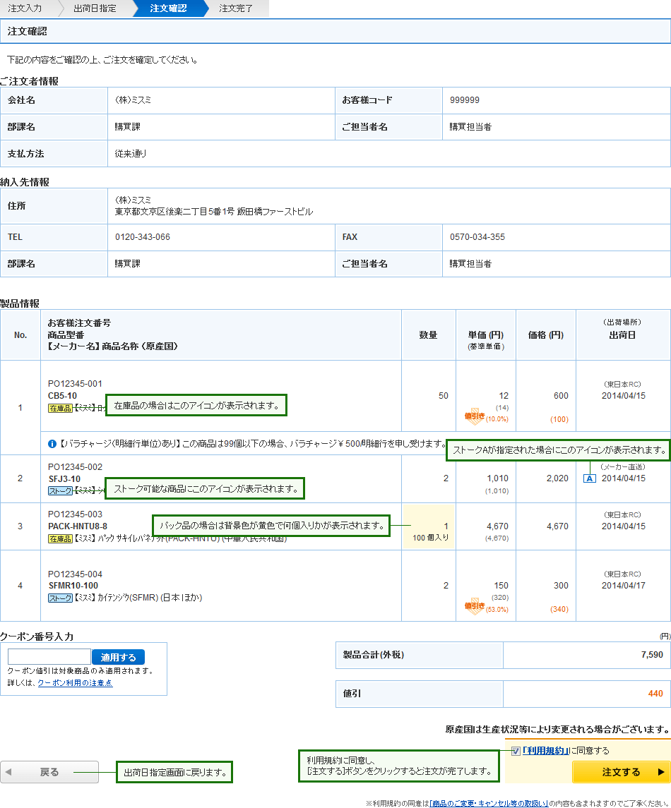 クーポンが適用された場合、適用されたクーポンの内容が表示され、単価と価格、合計金額に反映されます。