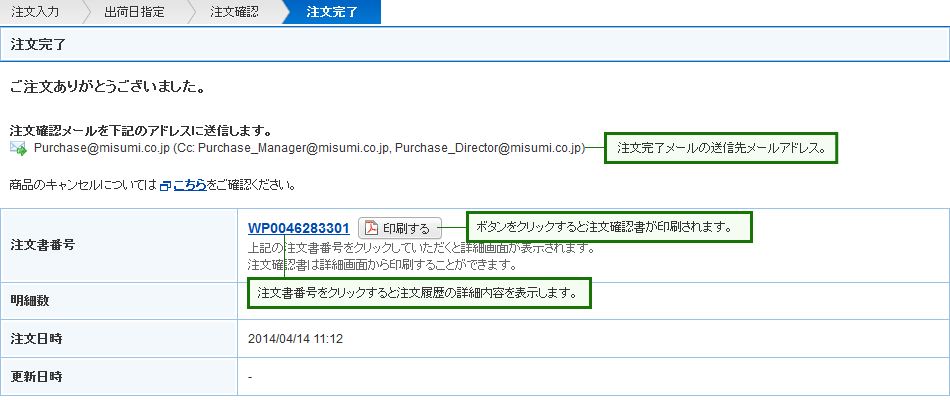 注文書を印刷する場合は、注文番号右横のPDFボタンをクリックしてください。