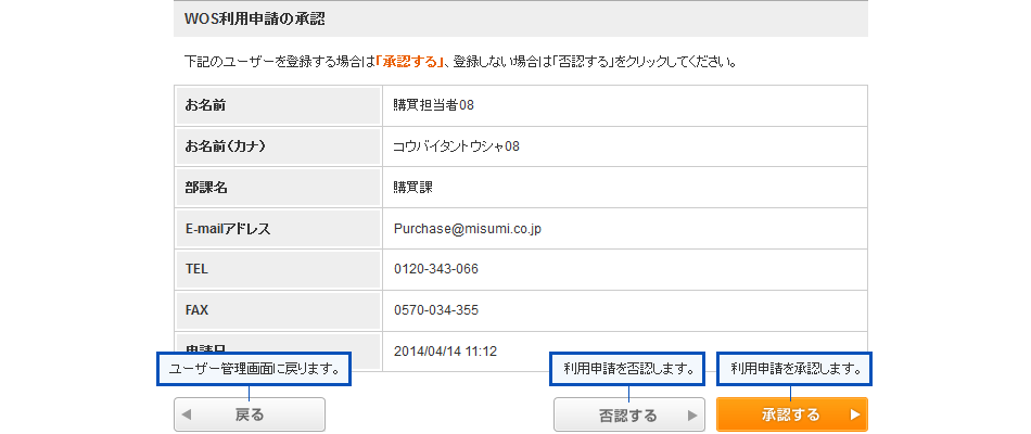 ユーザー管理権限があるユーザーは、本サイトの利用申請があった場合に「承認」、「否認」することができます。