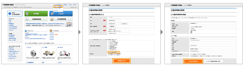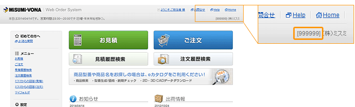 ご登録内容は一度ログアウトのうえ、再度ログイン後に見積・注文入力画面「納入先情報」からご確認いただけます。