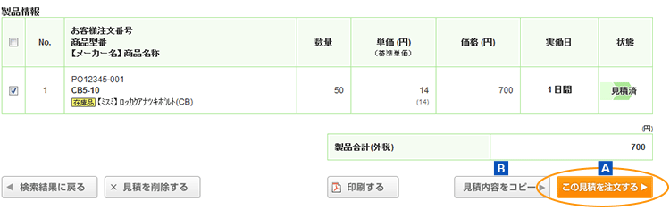 見積書番号/注文書番号をクリックしていただくと、詳細を確認いただくことが可能です。