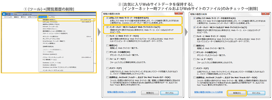 「削除」→「お気に入りWebサイトデータを保持する」、「インターネット一時ファイルおよびWebサイトのファイル」のみにチェックをいれ、「削除」をクリックしてください。