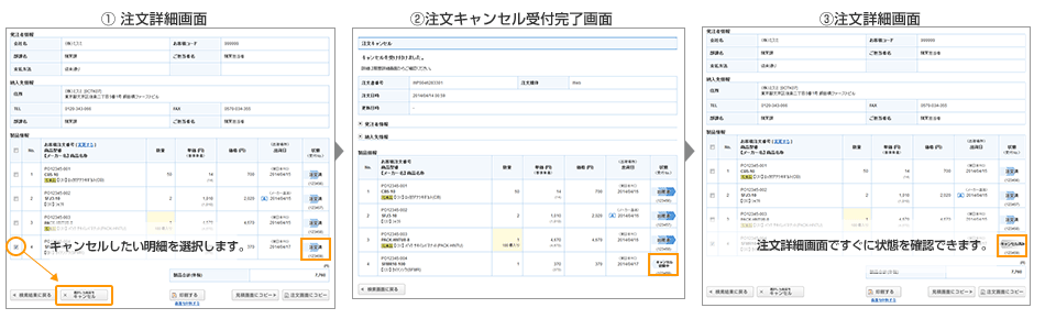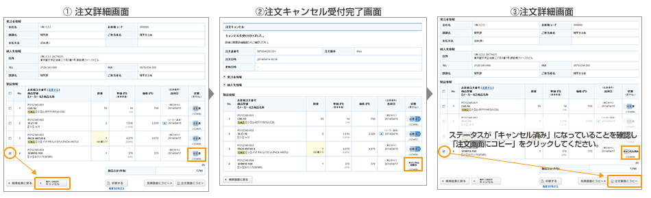 いずれも注文の詳細履歴画面から処理を行ってください。