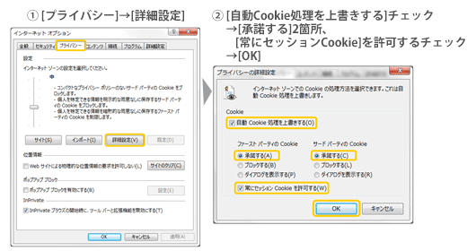 [詳細設定]⇒「自動Cookie処理を上書きする」、及び「受け入れる」を2ヶ所チェックして[OK]を選択します。