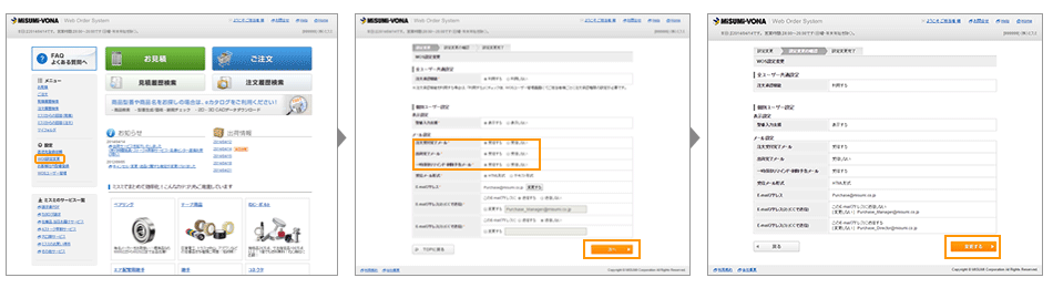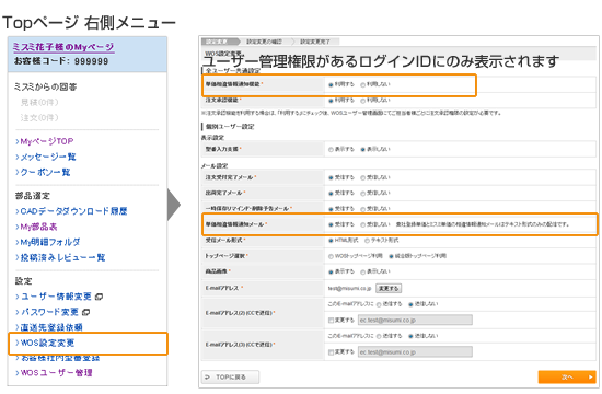 WOS設定変更画面にて一時保存リマインド・削除予告メールの受信メールアドレスの確認・変更など手続きが行えます。