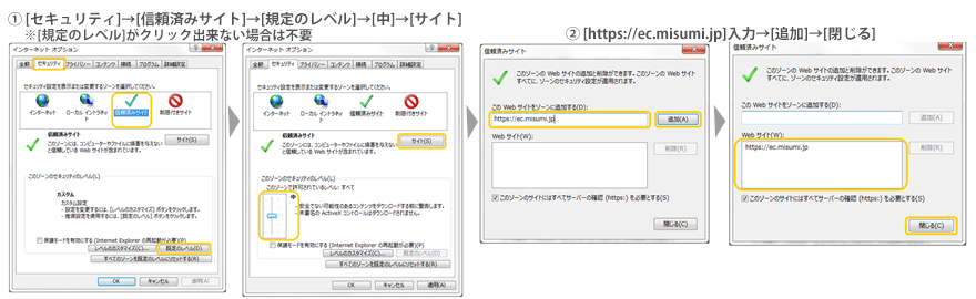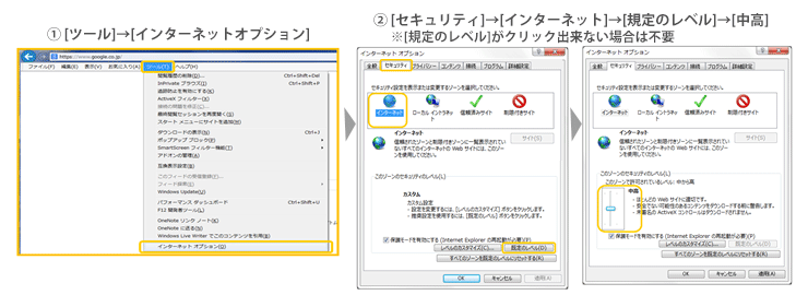 [ツール]→[インターネットオプション]→[セキュリティ]→[インターネット]→このゾーンのセキュリティレベルが「中高」になっているか確認