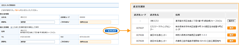 見積/注文に入力画面の該当明細にチェックの上、個別の直送先指定をクリックして、選択してください。