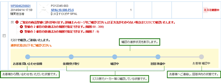 ※正しい型番が入力されている明細や、その他ミスミで確認が必要な明細等は表示されません。